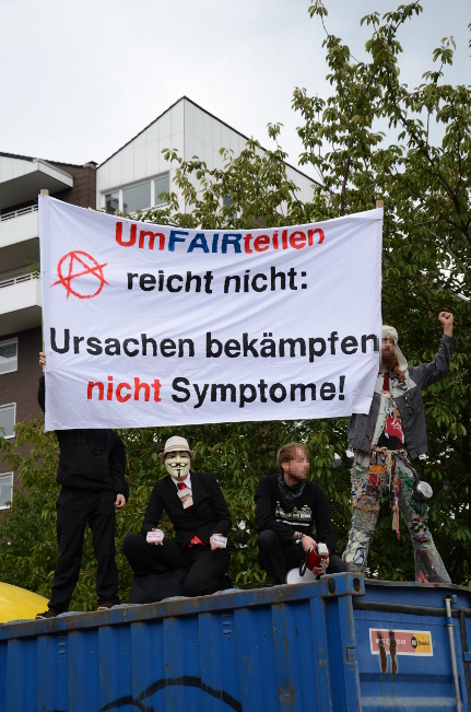 Der Aufruf zur Umverteilung des Reichtums kann ein Ausgangspunkt zur Initiierung von Klassenkämpfen und der Verbesserung der Situation vieler Menschen in der BRD sein. Die UnterstützerInnen des Bündnisses gehen davon aus, dass sie mit ihren Forderungen den Staat dazu bringen können, des Reichtum gerechter zu verteieln. Dabei verkennen sie die Rolle des Staates in einer kapitalistischen Gesellschaft. Seine vorrangigste Aufgabe ist es, die Verwertung des Kapitals und damit das Bestehen großer Banken und Konzerne abzusichern. Grade deshalb kann die Umverteilung nicht „erbettelt“ werden. Sie kann nur – als ein erster Schritt – durchgesetzt werden, wenn die Menschen, die in schimmeligen Klassenräumen, Arbeitsagenturen, Firmen und maroden Jugendzentren versauern, sich zusammenschließen und diese Umverteilung erkämpfen. Freiwillig leistet der Staat diese nicht.