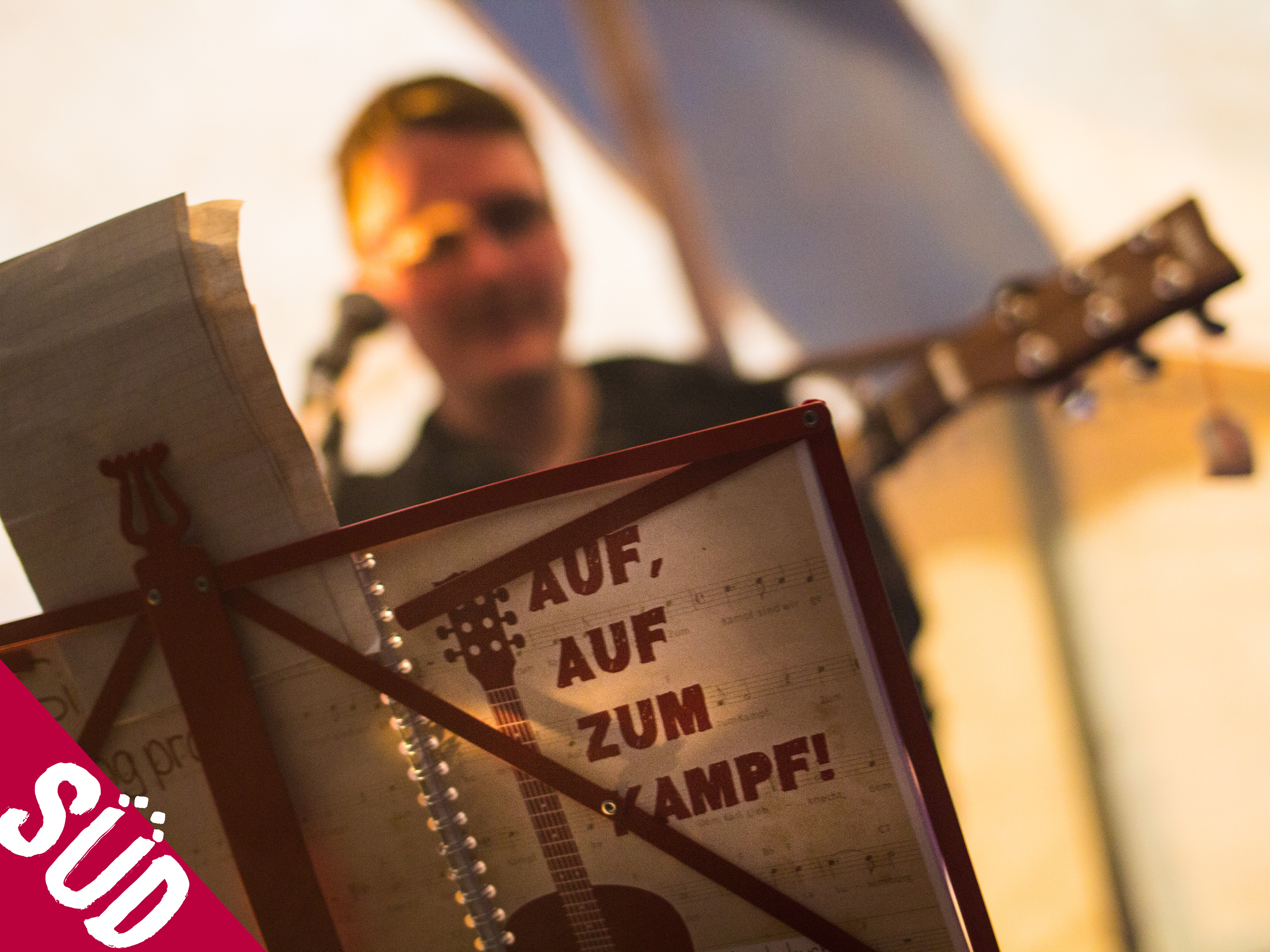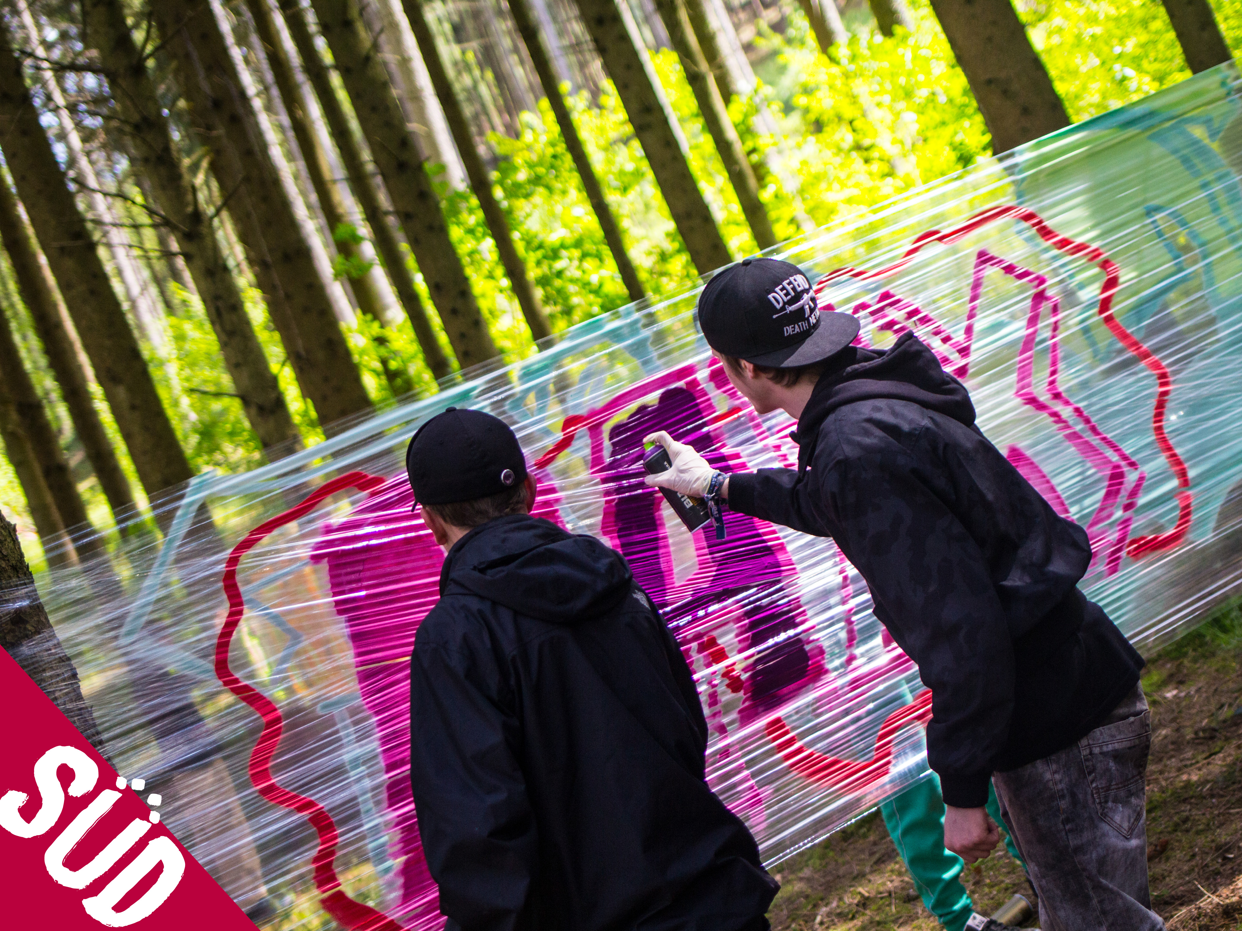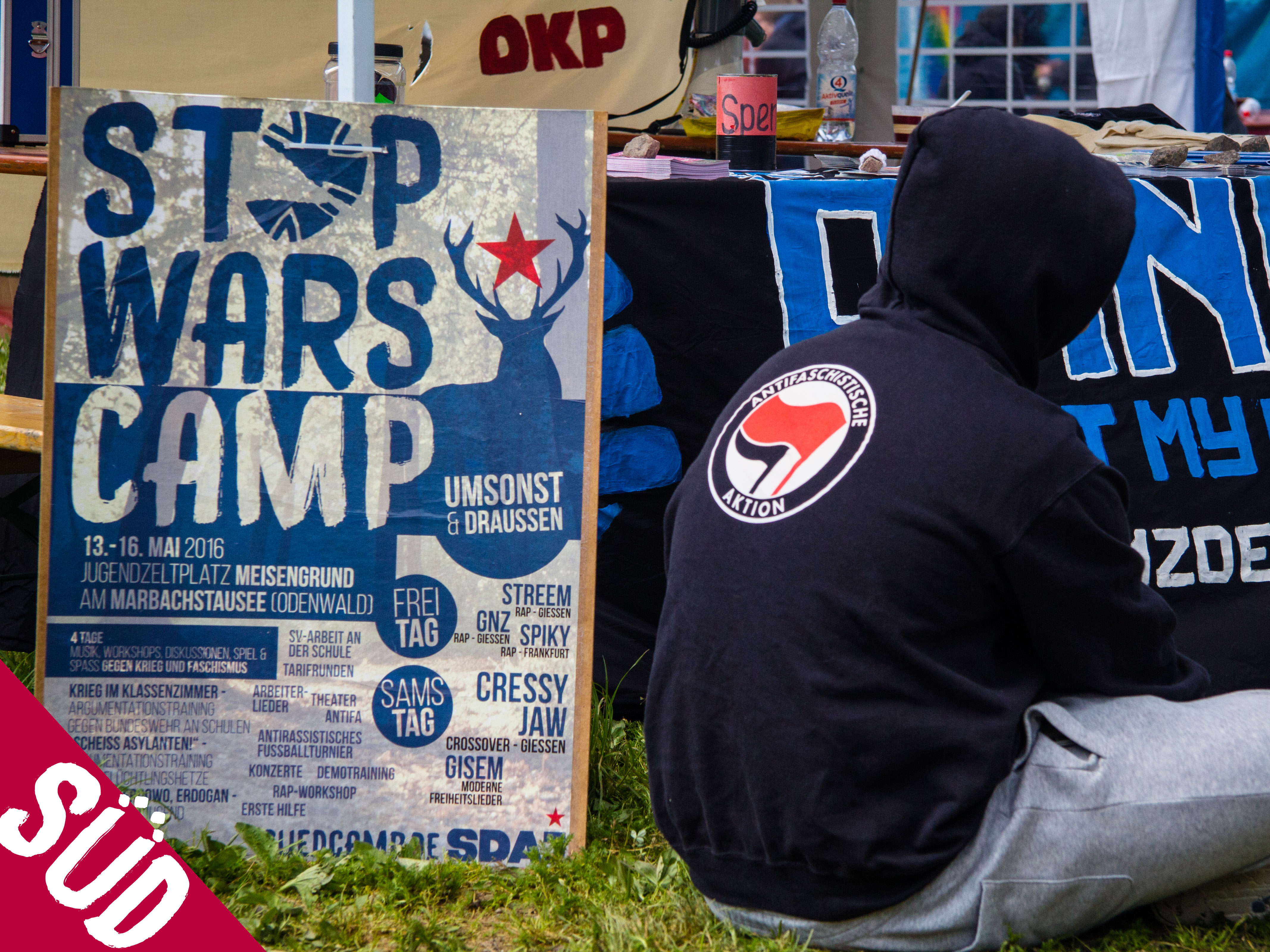 „Stop wars!“ war der Titel des Südcamps am Marbachstausee in Hessen. Workshops zu Rap, Tanz, Graffiti, Theater und Antirepressionsarbeit luden zum Mitmachen ein, Spiky, Streem, GNZ und verschiedene DJ’s sorgten für das musikalische Programm für die über 230 Besucherinnen und Besucher und bei der „Eis-See-Challenge“ ging der Landesverband Bayern als Sieger hervor. Sich gegenseitig argumentativ fit machen konnte man in Argumentationstrainings gegen Flüchtlingshetze und Bundeswehr in Schulen.