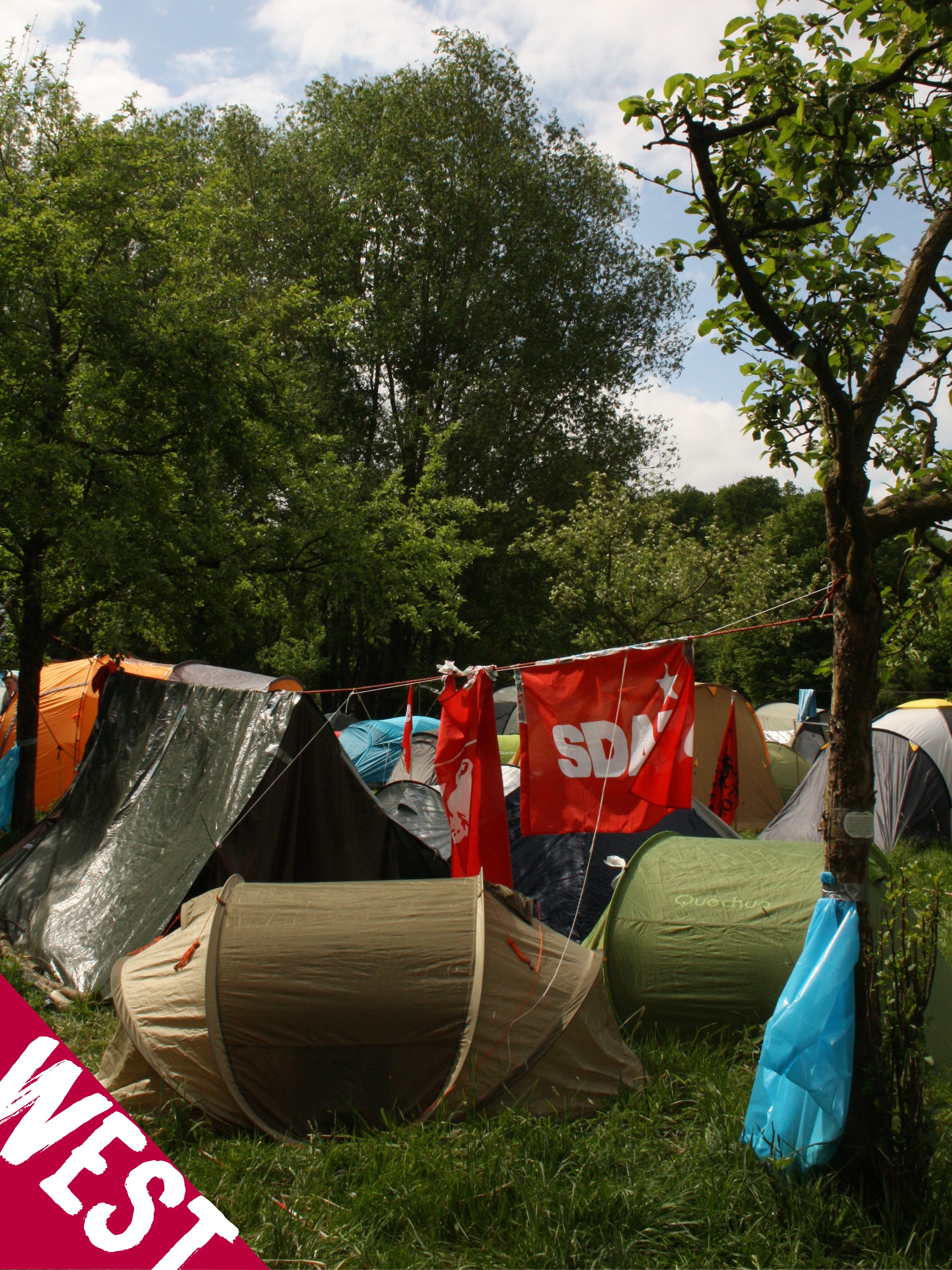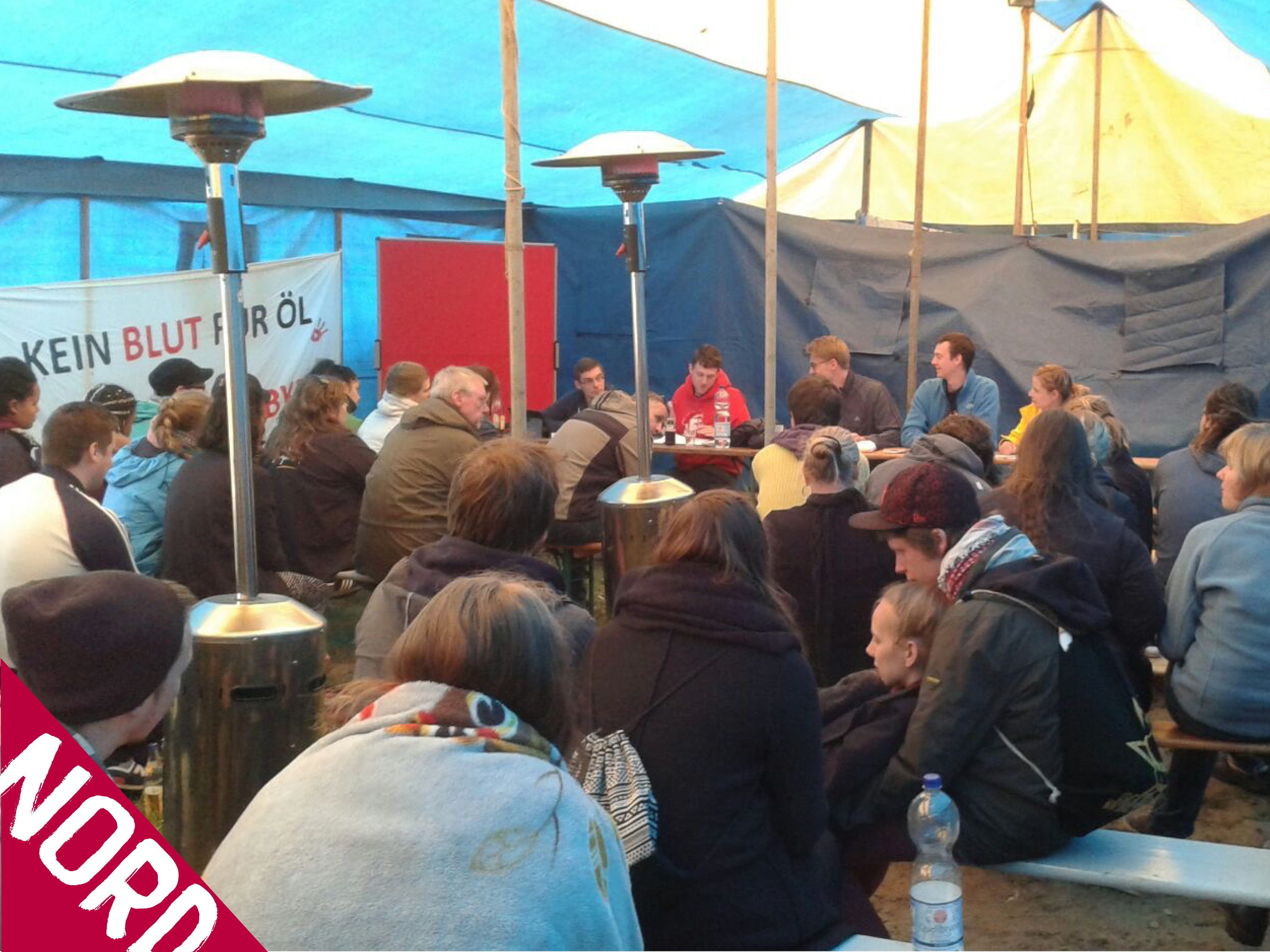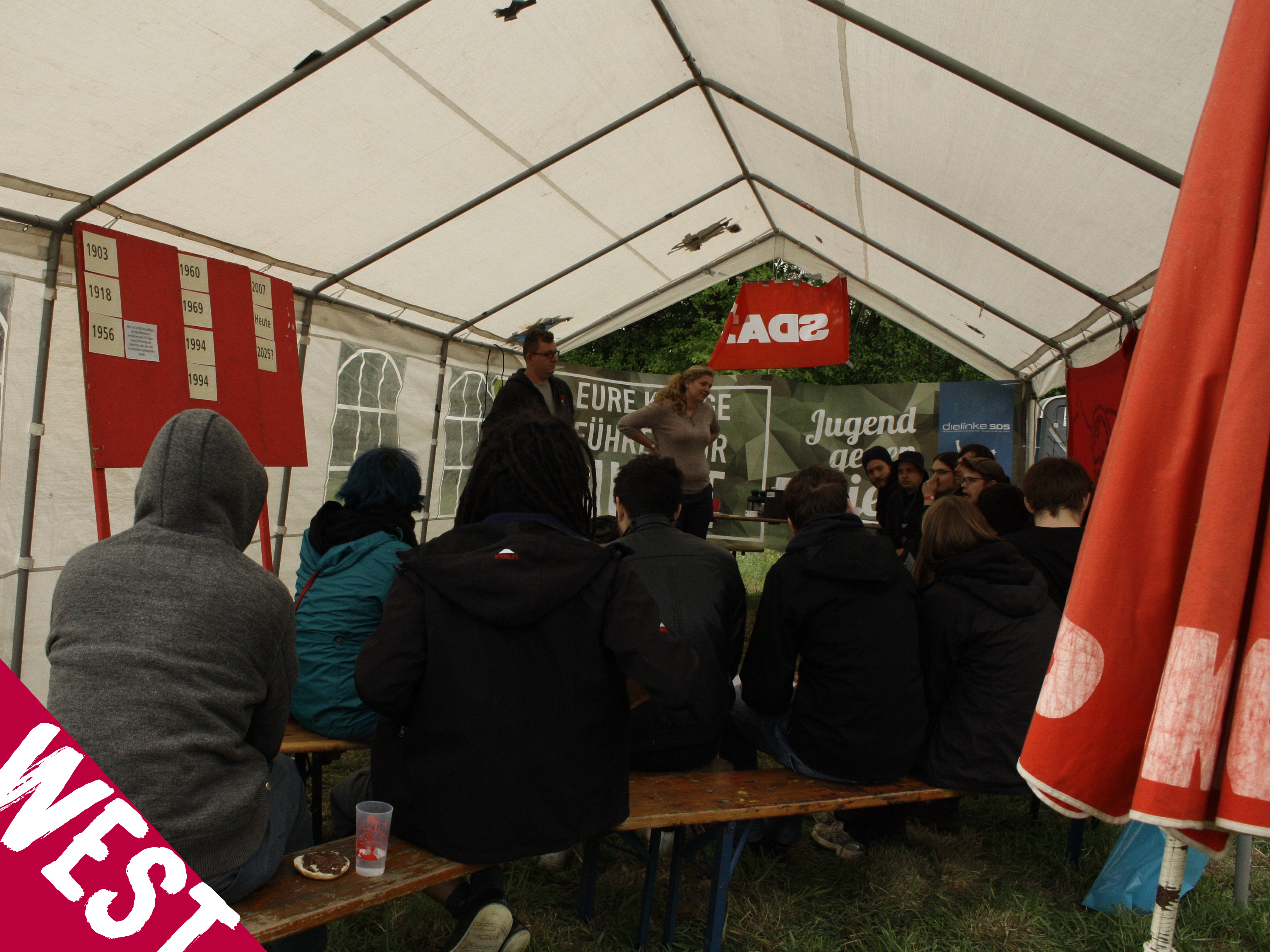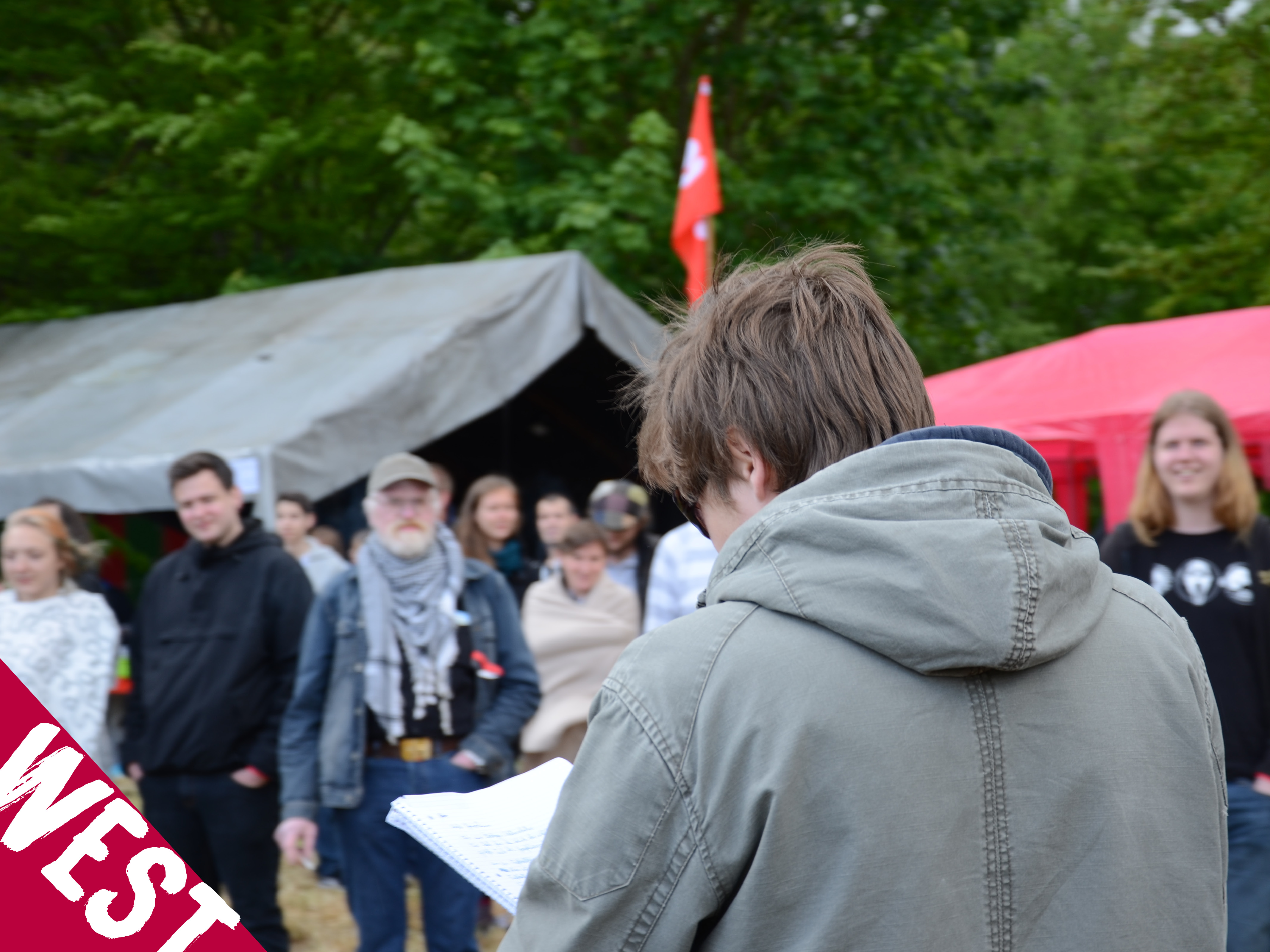 140 Besucherinnen und Besucher nutzten das Westcamp bei Münster, um „gemeinsam zu camp(f)en“, zu feiern und zu diskutieren. Emma’s Dream und The Cuckoo heizten dem Publikum beim Konzert am Samstagabend ordentlich ein. Blockadetraining, Fußballturnier und DJ Fred sorgten ebenfalls dafür, dass keine Langeweile aufkam. In informativen Diskussionsrunden mit Phillip Becher und Klaus Wagener zum Aufstieg der AfD bzw. dem Krieg in Syrien wurde ausgiebig nachgefragt und diskutiert. Deutlich wurde dabei auch, dass beides eng zusammenhängt: Die Kriege der NATO und der Bundeswehr in aller Welt sind die wichtigste Fluchtursache, denn niemand flieht freiwillig. „Das müssen wir in der ‚Flüchtligsdebatte‘ nach vorne stellen und gleichzeitig skandalisieren, dass zwar 130 Milliarden für Aufrüstung bereitgestellt werden, aber für die dringend notwendige Renovierung von Schulen kein Geld da ist und die Forderungen der Beschäftigten im öffentlichen Dienst in der letzten Tarifrunde als völlig überzogen dargestellt werden.“, so eine Teilnehmerin.